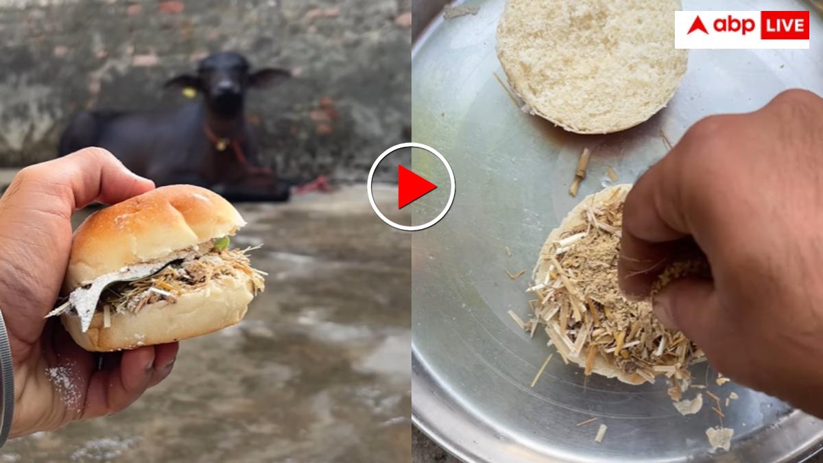 वीडियो में देखा जा सकता है कि शख्स सबसे पहले एकदम रेस्तरां स्टाइल में बर्गर बनाने की तैयारी करता है. वो बर्गर बन को दो हिस्सों में काटता है और उसमें सूखा चारा रखता है. इसके बाद वह जानवरों वाला सॉस (एनिमल फीड सॉस) ऊपर से डालता है. बर्गर को बड़े प्यार से बंद करता है और फिर उसे अपने पास बैठी भैंस को खिलाता है. भैंस भी बर्गर देखकर बिल्कुल उत्सुक नजर आती है और तुरंत उसे खाने लगती है. यह नजारा इतना मजेदार है कि देखने वाले अपनी हंसी रोक नहीं पा रहे.
